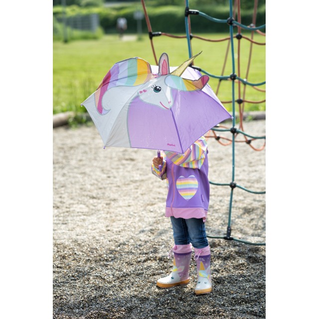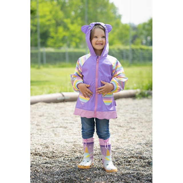 Trendovski, nepremočljivi gumijasti otroški škornji z vrvico na zaščitnem traku, v 3D vzorcu samorog, v lila barvi.