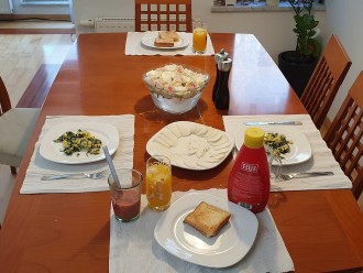 2) Privoščili si bomo skupen družinski zajtrk s pripravo sveže stisnjenega pomarančnega soka, umešana jajčka s svežimi šparglji, sledil bo zeliščni čaj iz posušenih zelišč preteklega poletja z domačim medom…., imeli bomo čas, da se v miru pogovorimo, kako se bomo organizirali za prihodnje dni.